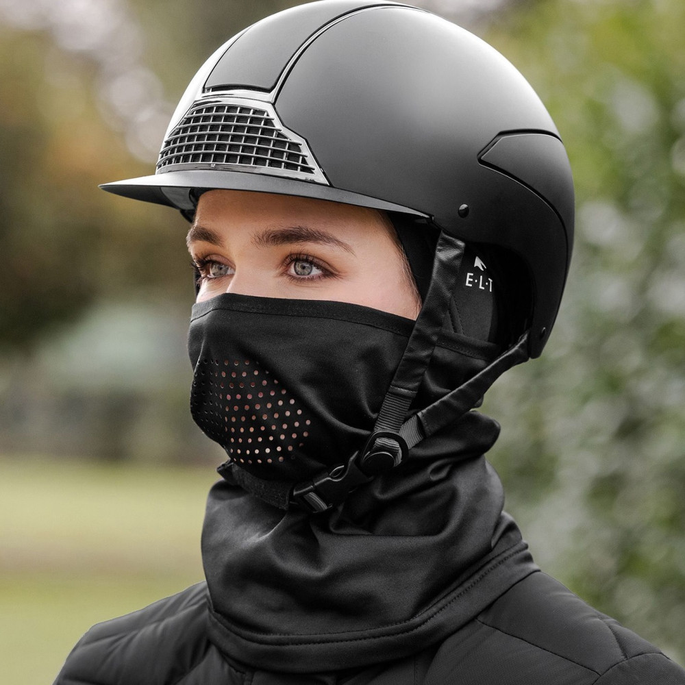 Балаклава під шолом для верхової їзди.Тонка та еластична, з флісовою підкладкою.Захищає від вітру та вологи.Лазерні отвори в ділянці рота для легкого дихання.Світловідбивний логотип E·L·T зліва.Матеріал: 92% поліестер, 8% еластан.