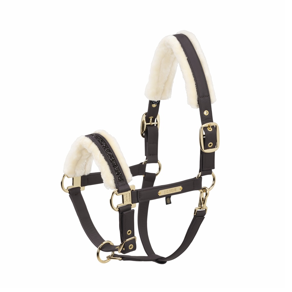 Недоуздок виготовлений із якісної штучної шкіри з внутрішньою текстильною основою, що забезпечує міцність і комфорт у використанні.М’яка підкладка зі штучного хутра в зоні носа та наголовника захищає від натирання й підвищує рівень комфорту для коня.Модель оснащена штифтовими пряжками з обох боків для точної регуляції, а також можливістю підгонки в зоні підборіддя.Золотиста металева фурнітура надає недоуздку елегантного зовнішнього вигляду, а носовий ремінь прикрашений декоративним камінням.З лівого боку розміщена фірмова металева пластина Eskadron, що підкреслює брендовий стиль виробу.Матеріал: 100% ПВХ.