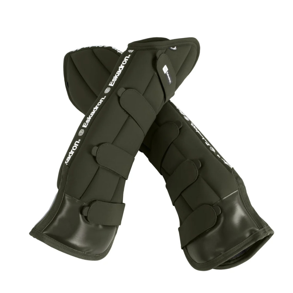 Захисні транспортні ногавки виготовлені з міцного та еластичного софтшелу з м’якою байковою підкладкою, що забезпечує комфорт і захист ніг коня під час перевезення. Надійну фіксацію гарантують численні липучки з фірмовим значком Eskadron.У нижній частині передбачене посилення з матеріалу Softslate, а на задній стрічці розташований напис Eskadron.Доповнені фірмовим прапорцем-лейблом.Практичний і зручний вибір для безпечного транспортування коня.Матеріал: 80% нейлон, 20% еластан.