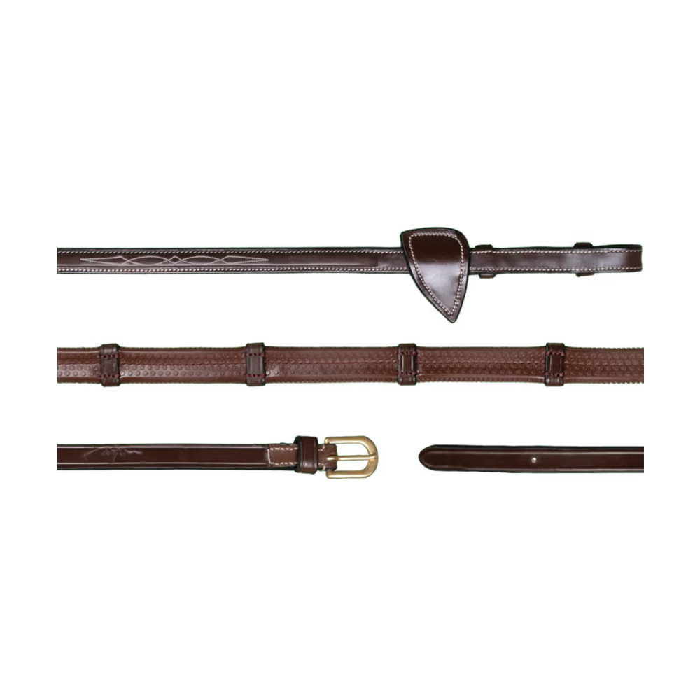 Поводдя для вуздечки Dy'on з неперевершеним зчепленням, гнучкістю та контролем забезпечують впевнену та комфортну їзду.Гумова ручка створює ідеальний баланс між еластичністю та надійним хватом, а сім шкіряних стопперів допомагають точно контролювати довжину поводів та запобігають ковзанню. Поводдя виготовлені з високоякісної європейської коров'ячої шкіри рослинного дублення, що гарантує міцність, довговічність та преміальне відчуття в руках.Вони підходять для конкуру, триборства та щоденних тренувань, забезпечуючи стабільний контроль навіть у складних умовах.