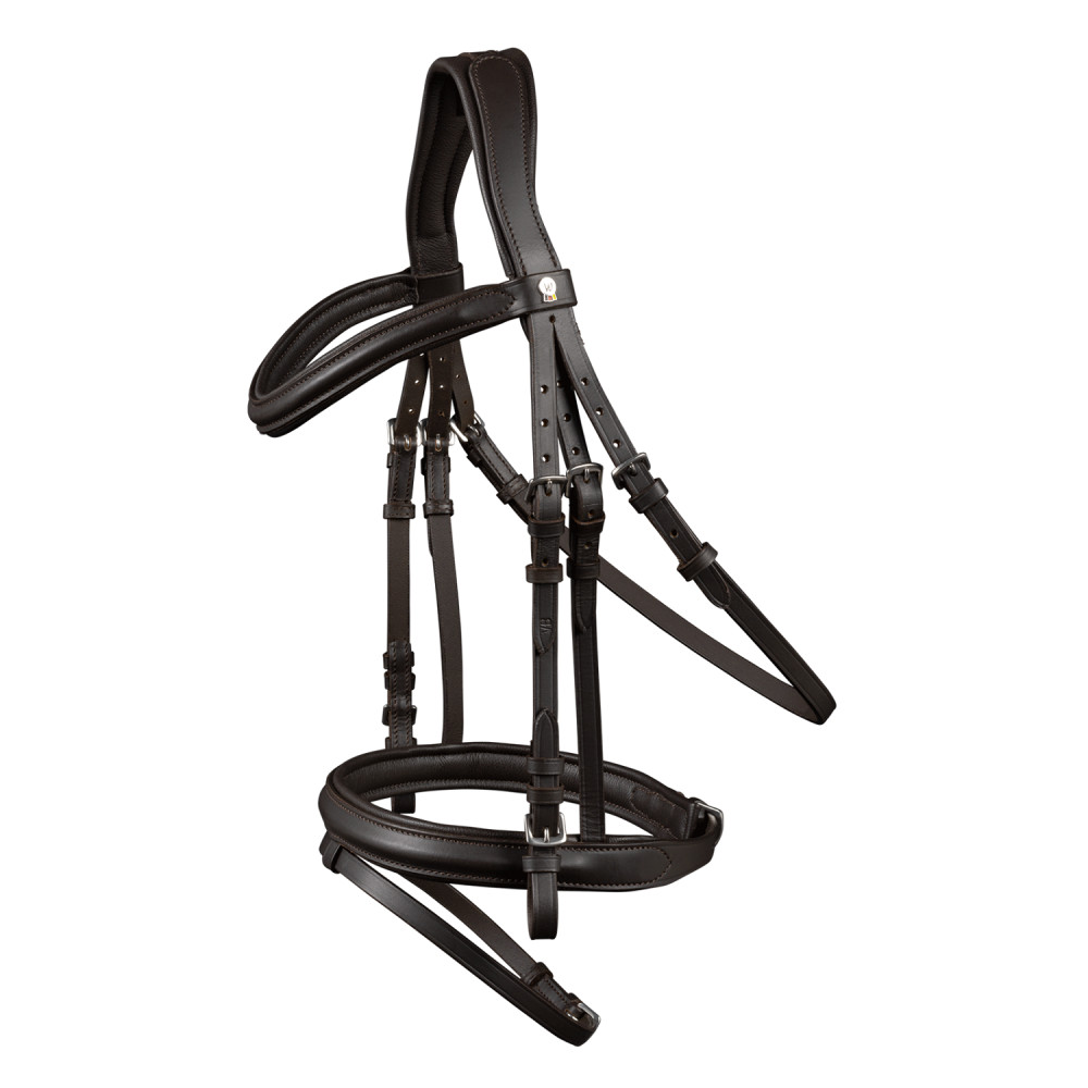 Анатомічна вуздечка з вигнутою налобною частиною забезпечує оптимальну посадку та комфорт для коня.Капсульний, налобний і потиличний ремені доповнені м’якою підкладкою, що зменшує тиск і натирання.Усі елементи оснащені міцною фурнітурою з нержавіючої сталі.У комплект входять поводдя з тасьми розміром 19 мм.